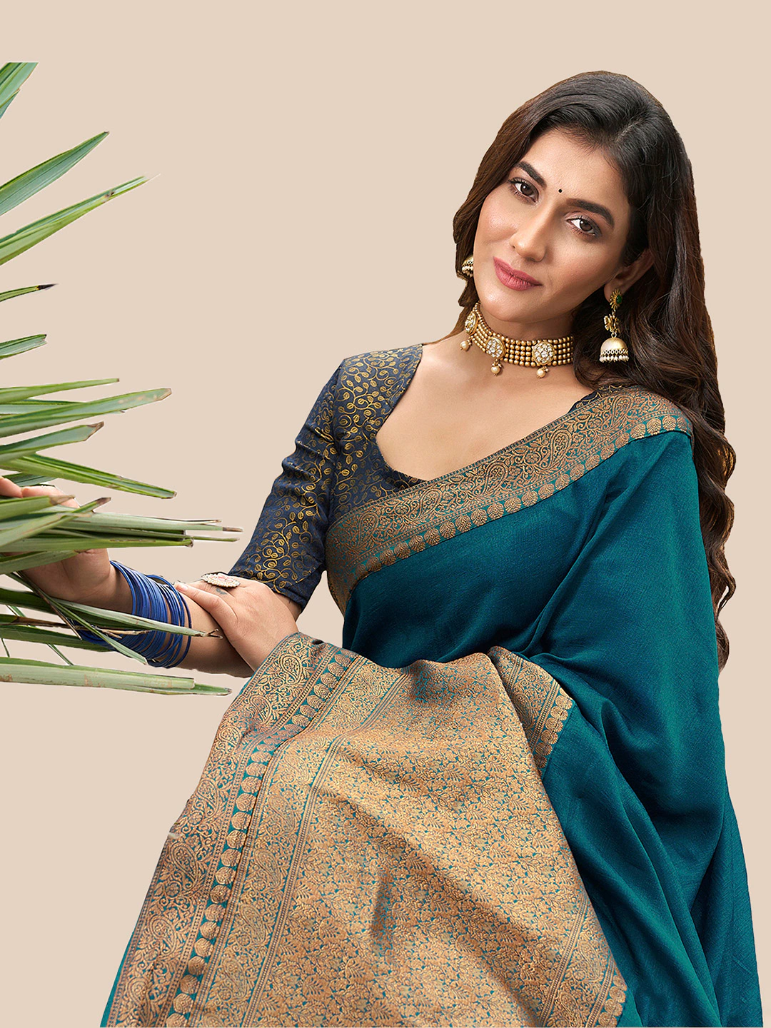 - Teal blue and golden banarasi saree