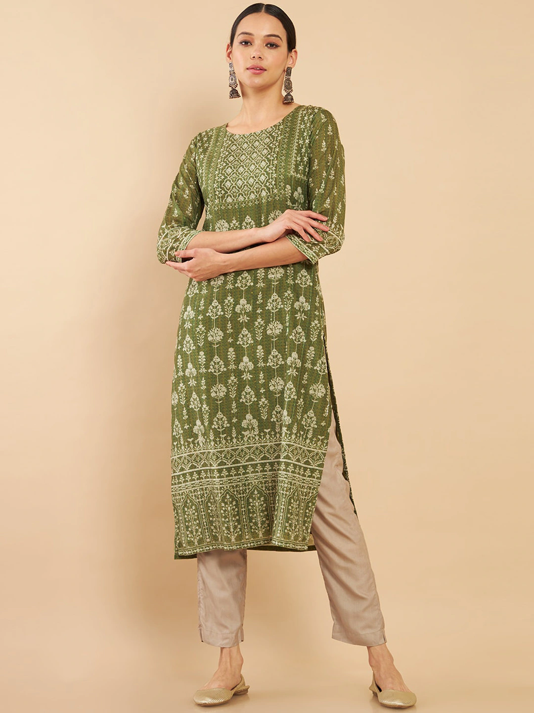 Women Green & Off-White Ethnic Motifs Printed Straight Muslin Kurta